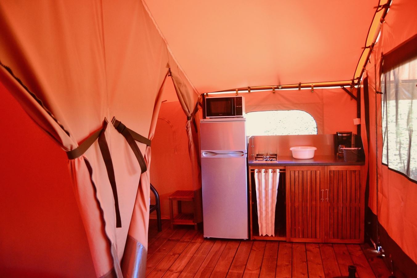 Coin cuisine/séjour : cuisine équipée : évier, feux gaz, réfrigérateur/congélateur, cafetière à filtre, micro ondes, vaisselle, 1 chauffage mobile.
