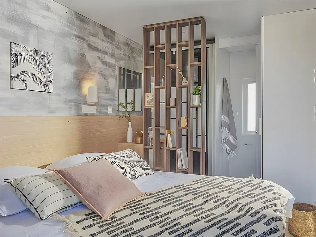 - Een Iroise stacaravan voor 4 personen met 2 slaapkamers, waarvan één master suite met eigen badkamer en toilet, een tweede slaapkamer met eigen badkamer en toilet, terras van 30 m², privé spa, ligstoelen en barbecue (Premium +).